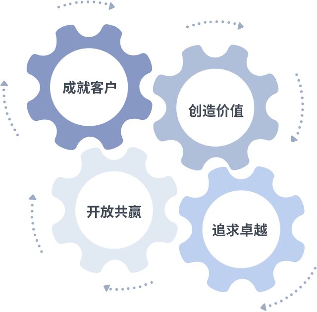 成就客户是一切决策的出发点,,,,创造价值是衡量所有工作的标准,,,追求卓越是我们做事做人的态度,,开放共赢是我们的格局也是最终的结果。。价值观的齿轮环环相扣,,,推动着组织里的每个人不断向前。。。。