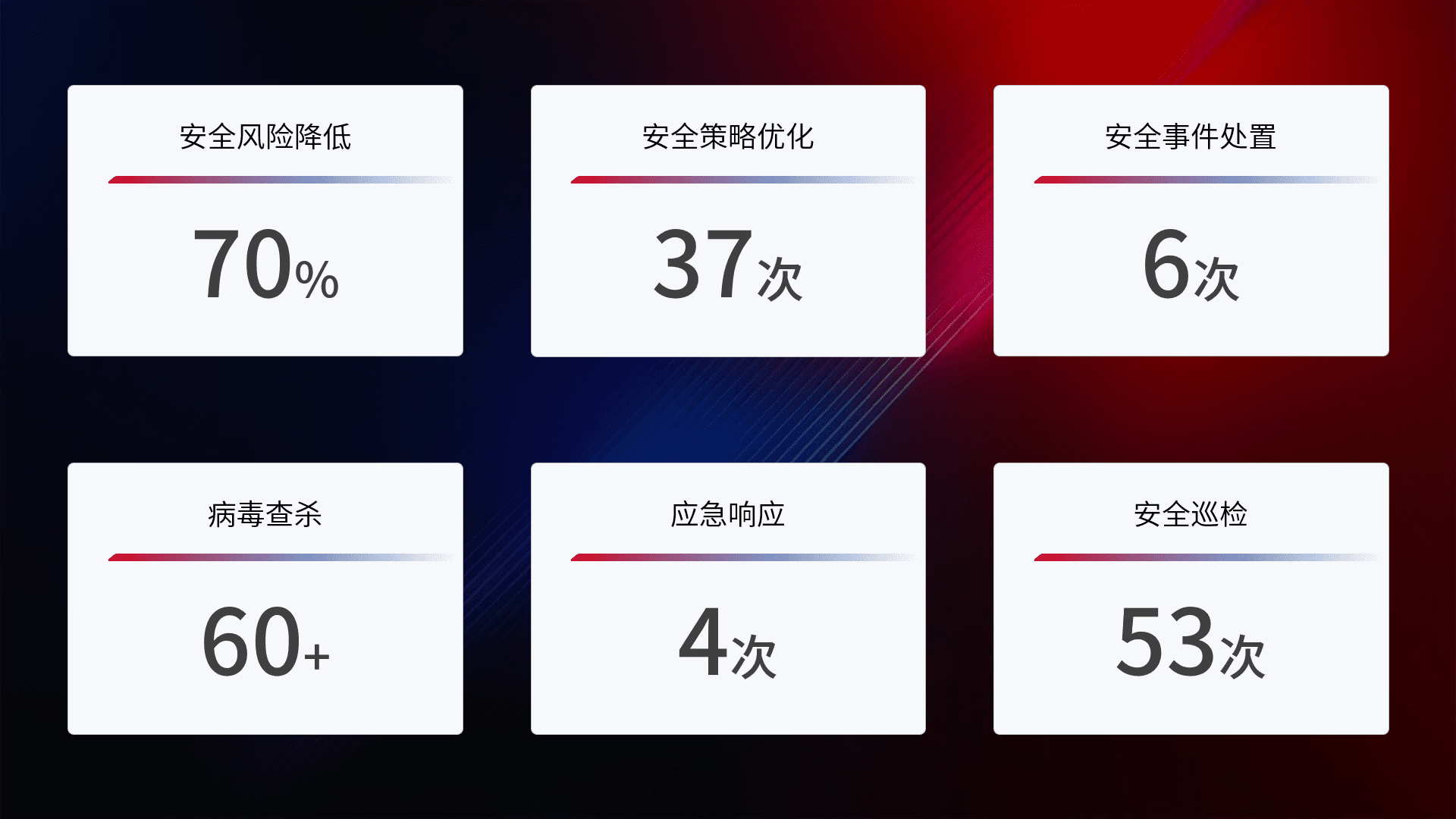 提供全面的安全事件报告体系,,包括处置报告、、周报、、季度和年度总结,,结合持续监控,,帮助客户深入了解网络安全状况。。