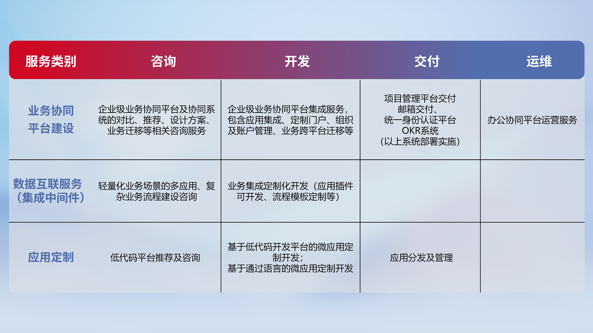 针对钉钉、、企微、、、、IDaas等平台级产品提供产品的规划、、、方案、、交付、、、定制化开发等服务,,实现如统一协同办公、、、、智能客户服务、、混合会议管理、、、、智能数据查询、、、等业务场景,,实现数字化转型。。